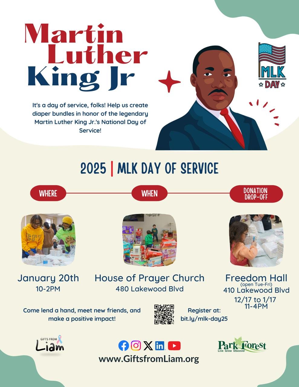JOIN US for another year of service on MLK Day! In celebration of Martin Luther King Jr.'s National Day of Service, we will package diaper donations for distribution to the community. The diaper packaging event will take place at the House of Prayer Church, located at 480 Lakewood Blvd, from 10 a.m. to 2 p.m. Stick around afterward to help load and transport packaged diapers.